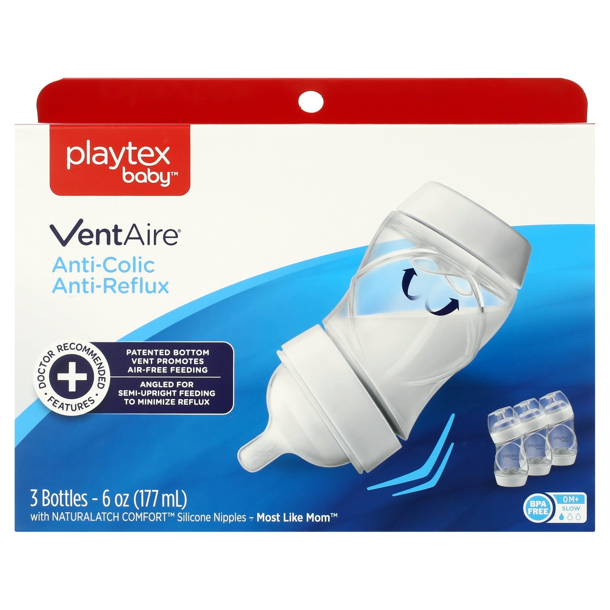 Playtex Baby VentAire bottles offer comfort and easy switching between breast and bottle feeding. Their doctor-recommended design helps prevent colic and reflux. The patented bottom vent ensures an air-free feed, while the ergonomic, angled shape encourages semi-upright feeding to prevent ear infections. The bottom vent also keeps air away from milk, reducing gas, burping, and fussiness. Each of these BPA, PVC, and Phthalate-free bottles come in a 3-pack 6 oz size, perfect for your baby's feeding needs.