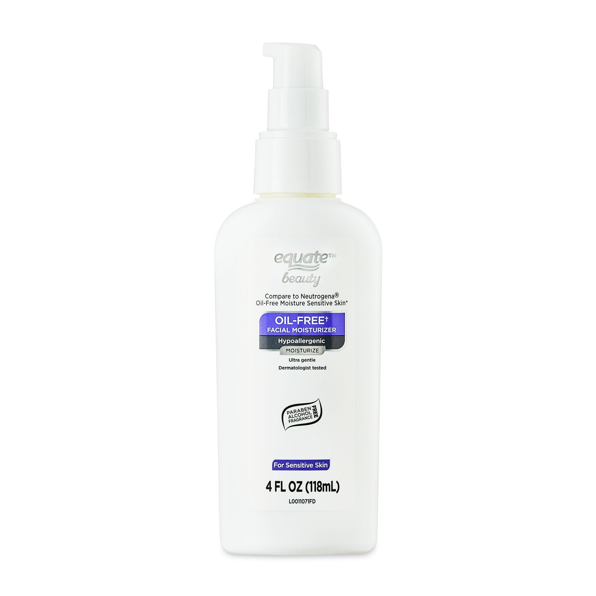Equate Beauty Oil-Free Facial Moisturizer for Sensitive Skin, 4 fl oz: For sensitive skin Oil and fragrance-free Enriched with humectants and emollients Hypoallergenic Not tested on animals Compare to Neutrogena Oil-Free Moisture Sensitive Skin
