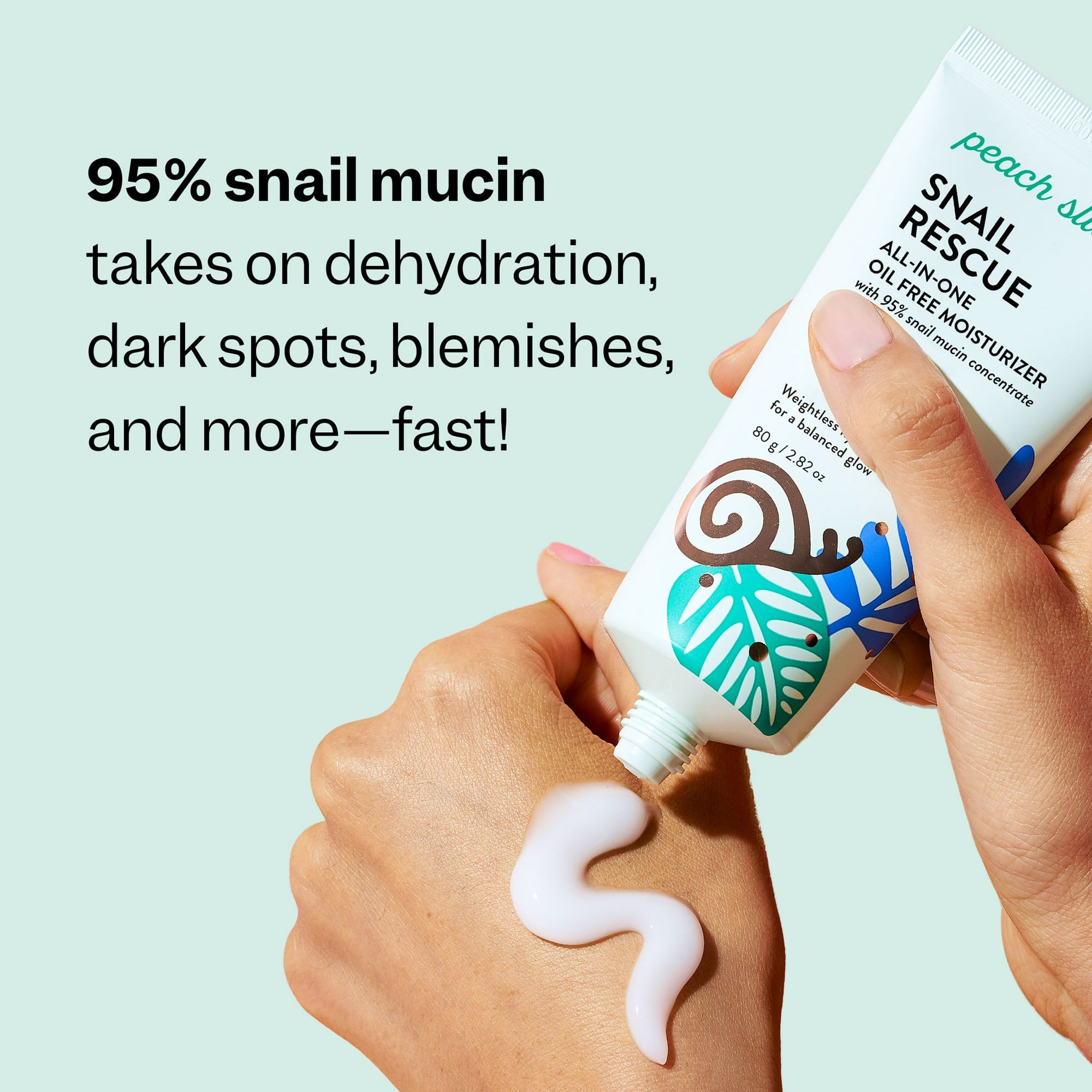 The Peach Slices Snail Rescue All-in-One Oil-Free Moisturizer is your fast track to hydrated, blemish-free skin with an even-toned glow. Made with 95% Snail Mucin Concentrate, which helps bind moisture to skin while exfoliating skin, hydrating Hyaluronic Acid and Centella Asiatica Extract (Cica), and brightening Birch Juice and Strawberry Extract, this face moisturizer quenches thirsty skin, zaps zits, and minimizes shine. The oil-free moisturizer is lightweight (so it doesn't clog pores!) and great for all skin types, including dry, normal, oily, and combination skin. Made without sulfates, fragrances, alcohol, formaldehyde, dyes, colorants, parabens, mineral oils, or silicones, it is gluten-free, vegan, cruelty-free, and Leaping-Bunny certified. Say hello to better, brighter skin with the Peach Slices Snail Rescue All-in-One Oil-Free Facial Moisturizer!