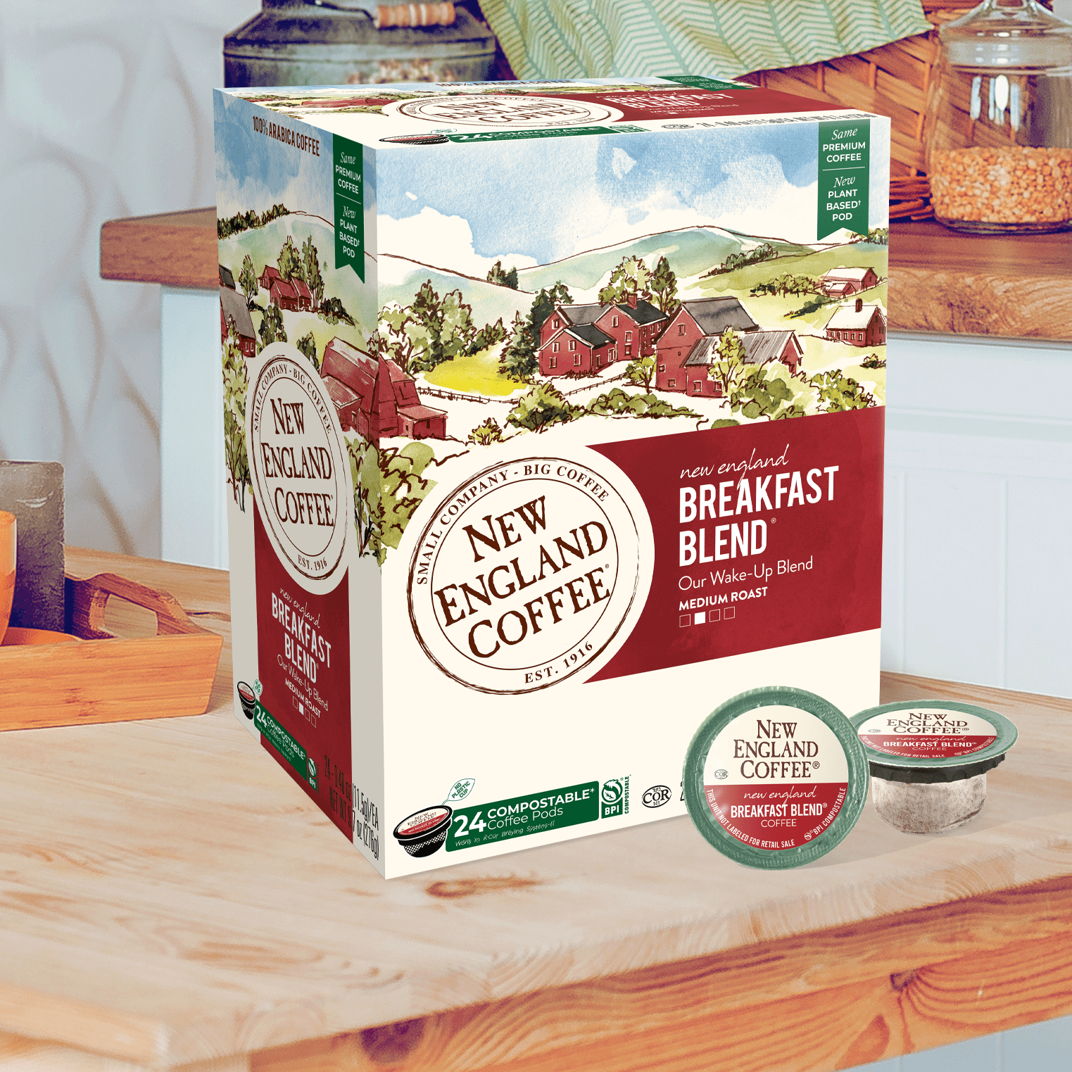 New England Coffee Breakfast Blend Single Serve Coffee Pods is roasted with the finest beans from Africa, Central and South America, in a hearty wake-up blend. This particular brew is medium roast coffee and naturally caffeinated. WeÕve roasted our premium coffee the same time-tested way for over 100 years. Now in compostable plant-based mesh pods for a better-quality coffee experience you can see, smell and taste.