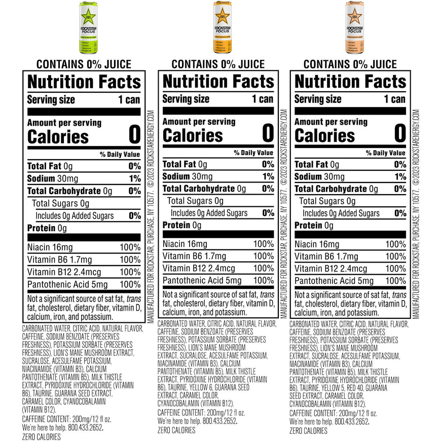 Rockstar Focus Energy Drink is made with lionÕs mane for energy & mental boost. Rockstar Focus Energy Drink has zero calories and zero sugar, all flavor, no guilt. With zero sugar and 200mg Caffeine per 12 oz can, Rockstar Focus Energy Drink is your energy & mental boost companion, so you can be in the moment. Boss your day with sustained energy & focus. Rockstar Energy Drink is designed for those who lead active lifestyles - from Athletes to Rock Stars.
