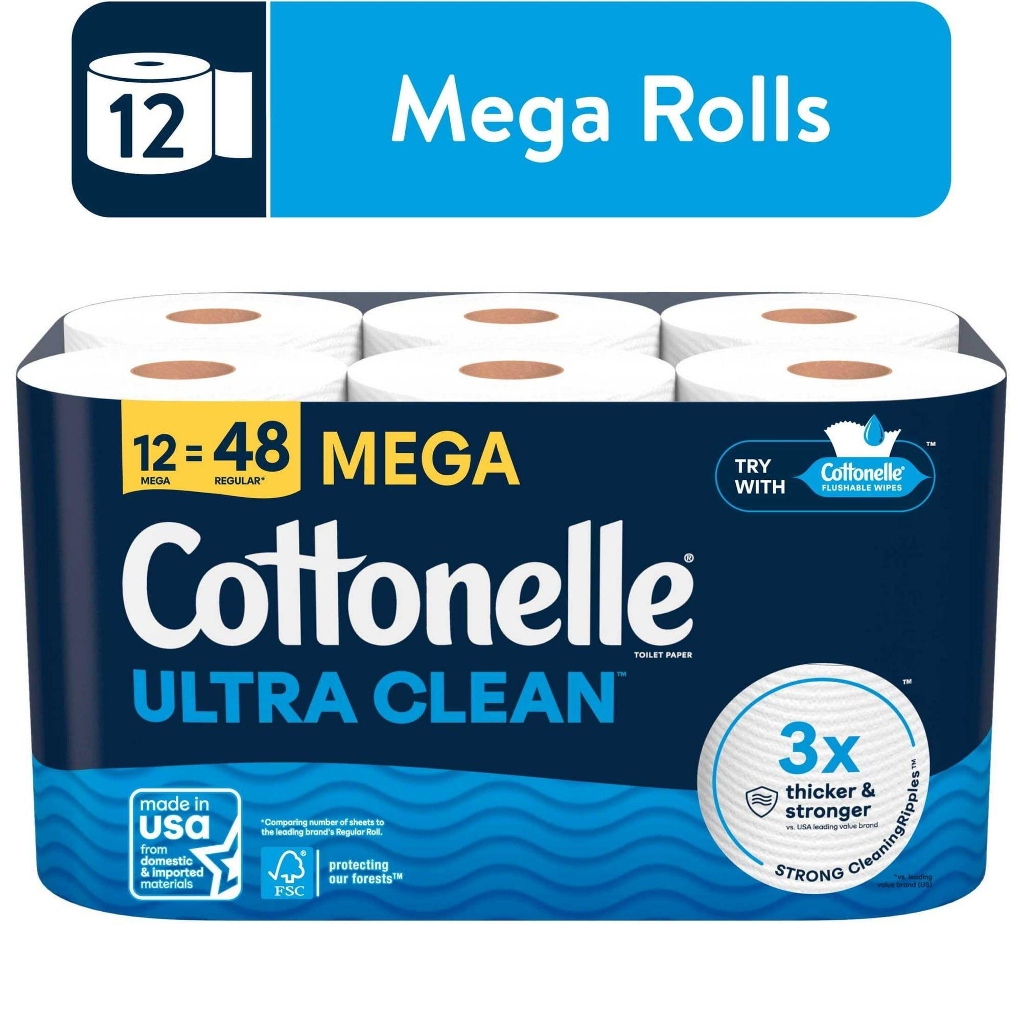 Cottonelle Ultra Clean Toilet Paper, Strong Toilet Tissue, 12 Mega Rolls