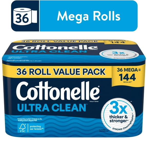WHAT'S INCLUDED Ñ This toilet paper pack includes 36 Mega Rolls of Cottonelle Ultra Clean 1-Ply Toilet Paper with 284 sheets per roll (1,076.40 square feet total); packaging may vary