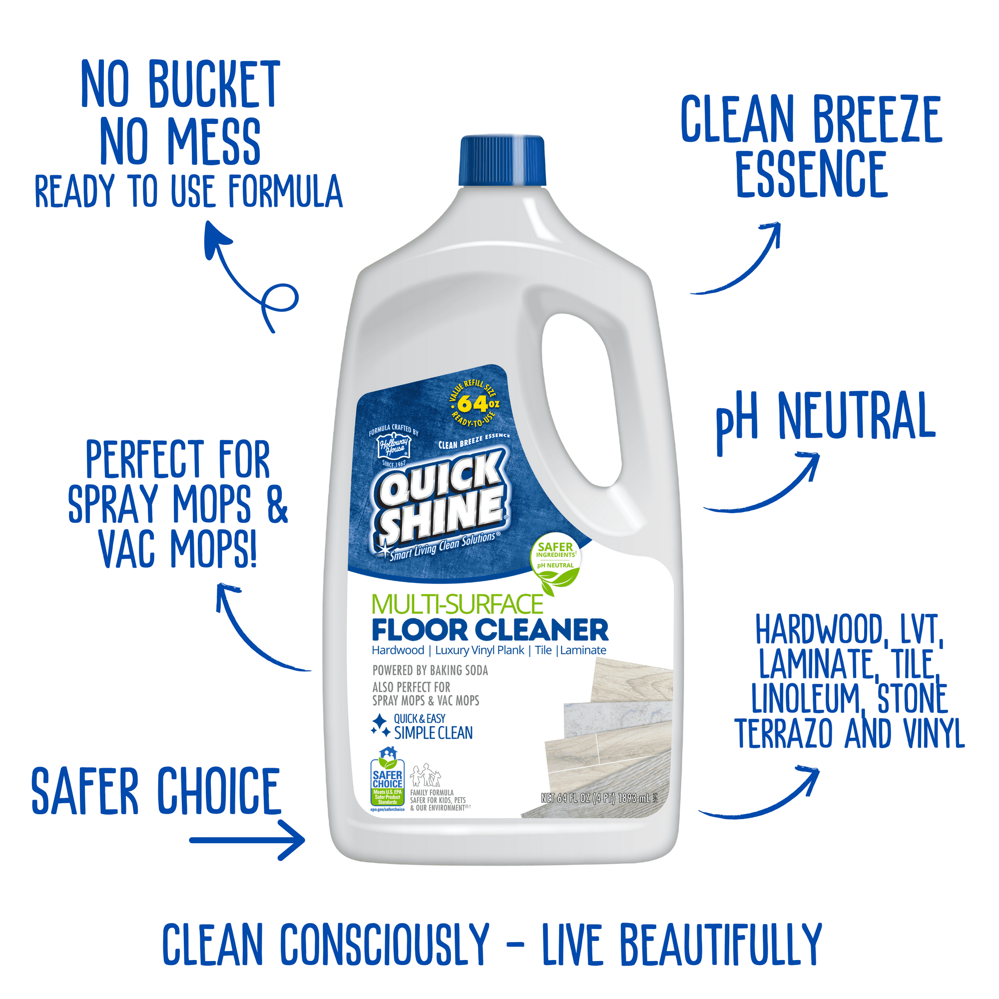 Meet your cleaning crew. Home is where the love is (and messes) and everyday cleanups are made easy with QUICK SHINE Multi-Surface Floor Cleaner, so you spend more time enjoying what matters most. QUICK SHINE Multi-Surface Floor Cleaner, 64oz, refill size, is safe for hardwood, Luxury Vinyl Plank, Luxury Vinyl Tile, laminate, tile and stone. The ready-to-use, fresh scent, no rinse formula is plant-based and pH neutral, and dissolves dirt and leaves a streak free shine for quick and easy cleaning.
