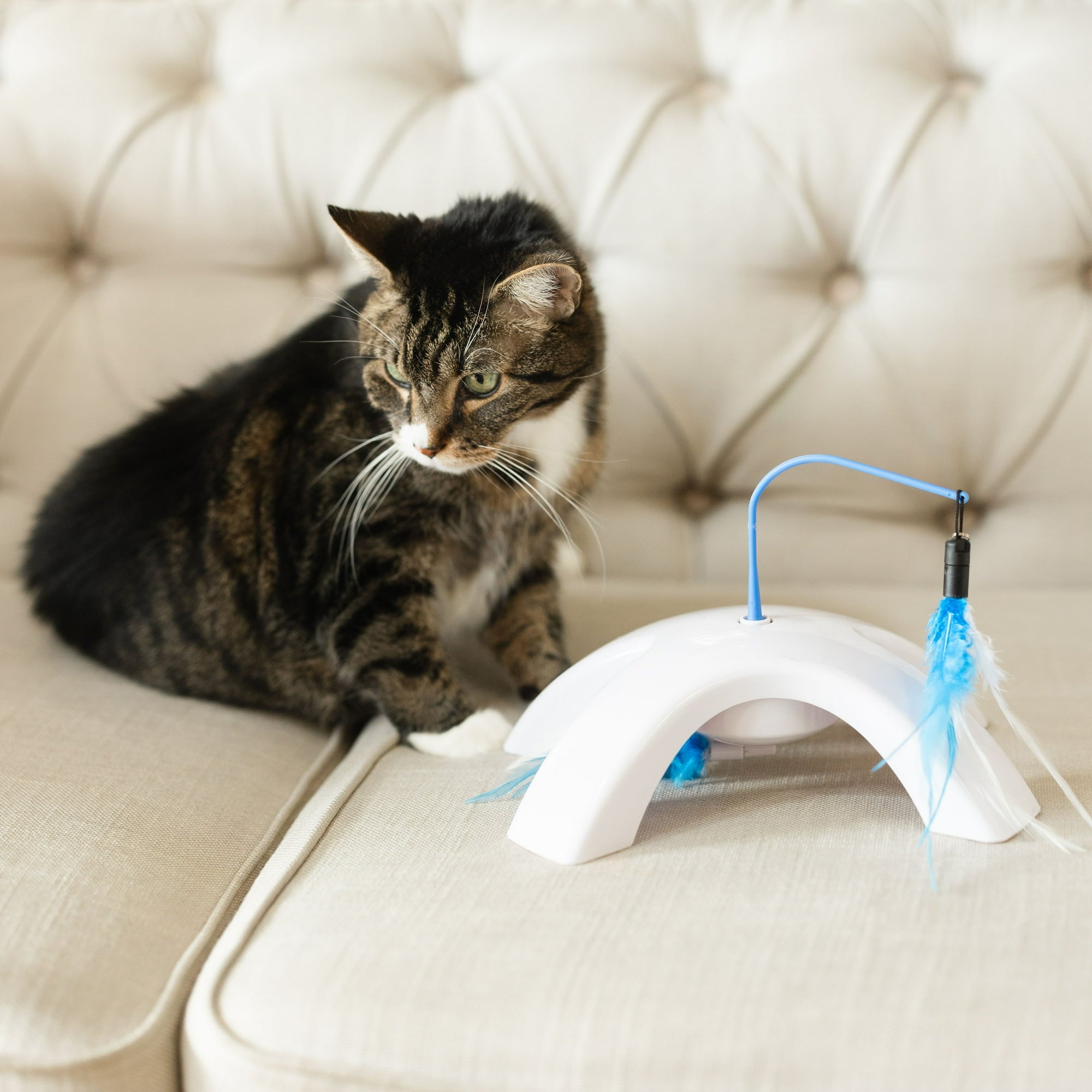 Arched base contains two motorized wands tipped with fluttery feathers that zip and twirl unpredictably at the press of a button