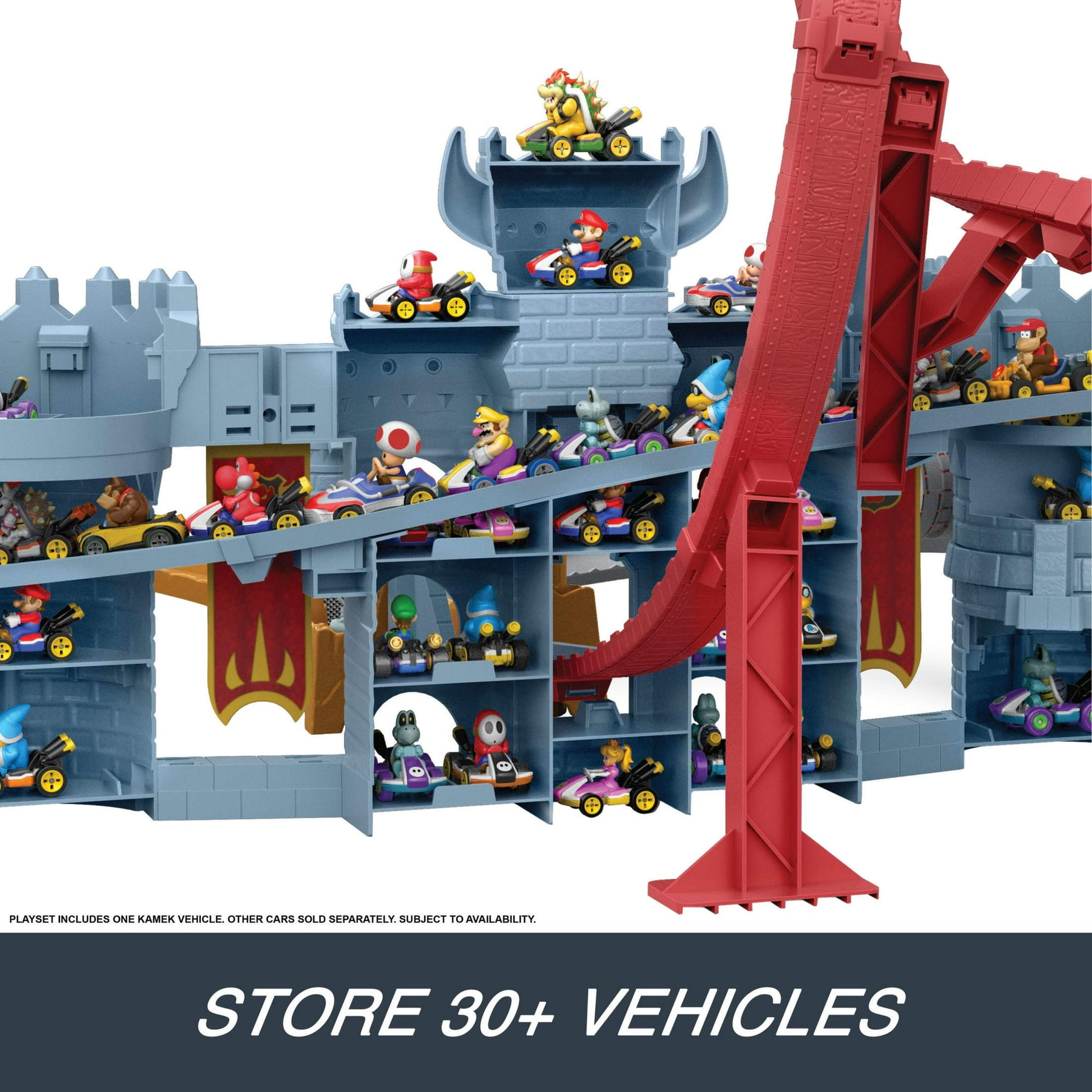 Store up to 38 vehicles in various spots on the set to always have racers on-hand. (Includes one Hot Wheels Mario Kart Kamek; additional vehicles sold separately.)