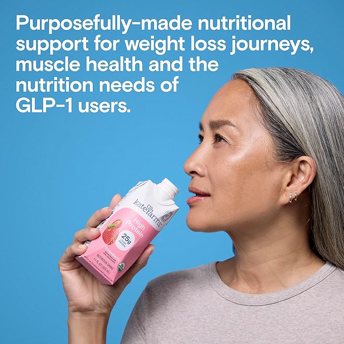 KATE FARMS Organic High Protein Strawberry Nutrition Shake, 25g Protein, 6g Fiber, 27 Vitamins and Minerals, 0g Sugar, Protein Drink, 11 oz (12 Pack)