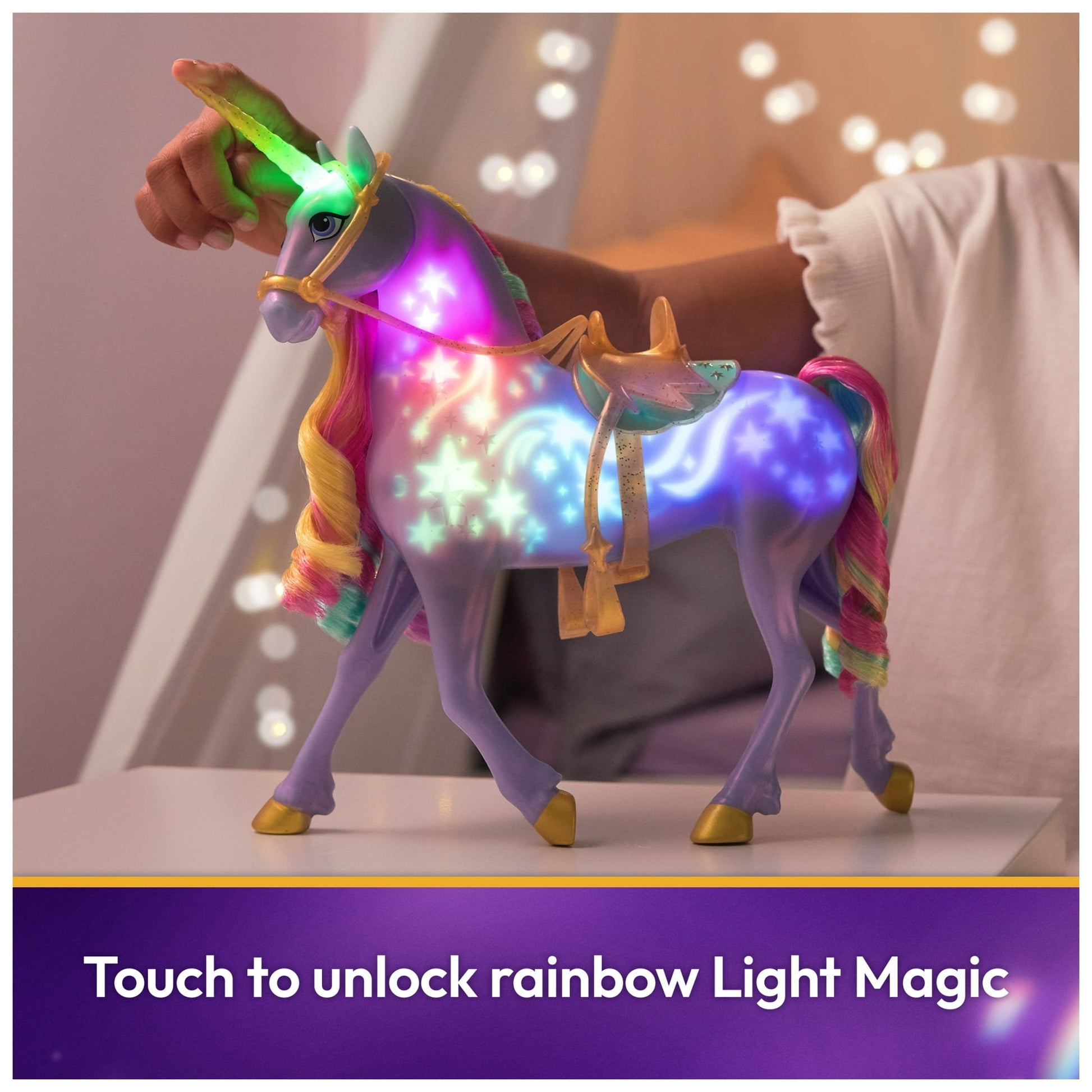 Discover your destiny with Unicorn Academy Rainbow Light-up Wildstar! Inspired by the NETFLIX animated show and best-selling book series, this 11-inch interactive unicorn responds to touch with rainbow lights, sound effects and songs from the show! Featuring light-up Light Magic markings, rainbow mane and tail, and more, kids can recreate the magical bonding moment with Wildstar from the show. Rub WildstarÕs face, touch her horn, and pull her reins to see her react! As your bond builds, WildstarÕs white lights shine brighter, changing to rainbow when youÕve earned her trust. Hold her face to complete the bond and youÕll hear Wildstar celebrate with the showÕs theme song! After bonding, hold WildstarÕs face to replay music, touch her horn for guiding light and more! Pose Sophia (doll sold separately) and ride into adventure! Expand your Unicorn Academy world with the fashion dolls and unicorns (each sold separately). For ages 4 and up who enjoy unicorns and horse toys, dolls & accessories, doll house play, collectibles, plush toys and more, Unicorn Academy toys are fun birthday gifts for girls or gifts for any occasion. Includes 2 AA batteries and features songs in English, French and Spanish. Experience the extraordinary with Rainbow Light-up Wildstar!